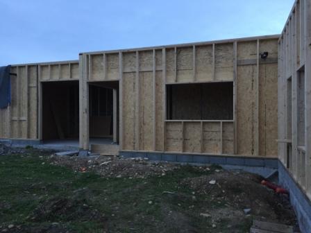 Construction d'une maison en ossature bois avec contreventement en intérieur, double isolation par l'extérieur en fibre de bois entre montants et en fibre de bois servant de support d'enduit.